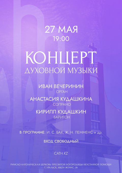 Концерт в честь 20-летия прихода Во вторник 10 октября 2023 года в 19:00 состоится концерт к 20-летию католического прихода в Уральске во имя Пресвятой Богородицы Неустанной Помощи. Иван Вечеринин (орган), Анастасия Кудашкина (сопрано) и Кирилл Кудашкин (баритон).